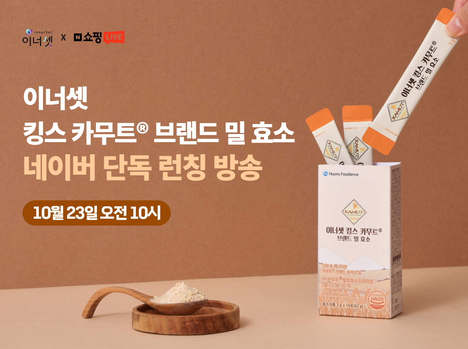 이너셋은 23일 오전 10시부터 한 시간 동안 네이버 라이브방송에서 ‘이너셋 킹스카무트 브랜드밀 효소’를 선보인다. 구매자들에게 1만원 이상 구매 시 5% 쿠폰 증정, 5만원 이상 구매 시 수용성 커큐민(5만원 상당) 제품 증정 등 혜택을 제공한다.