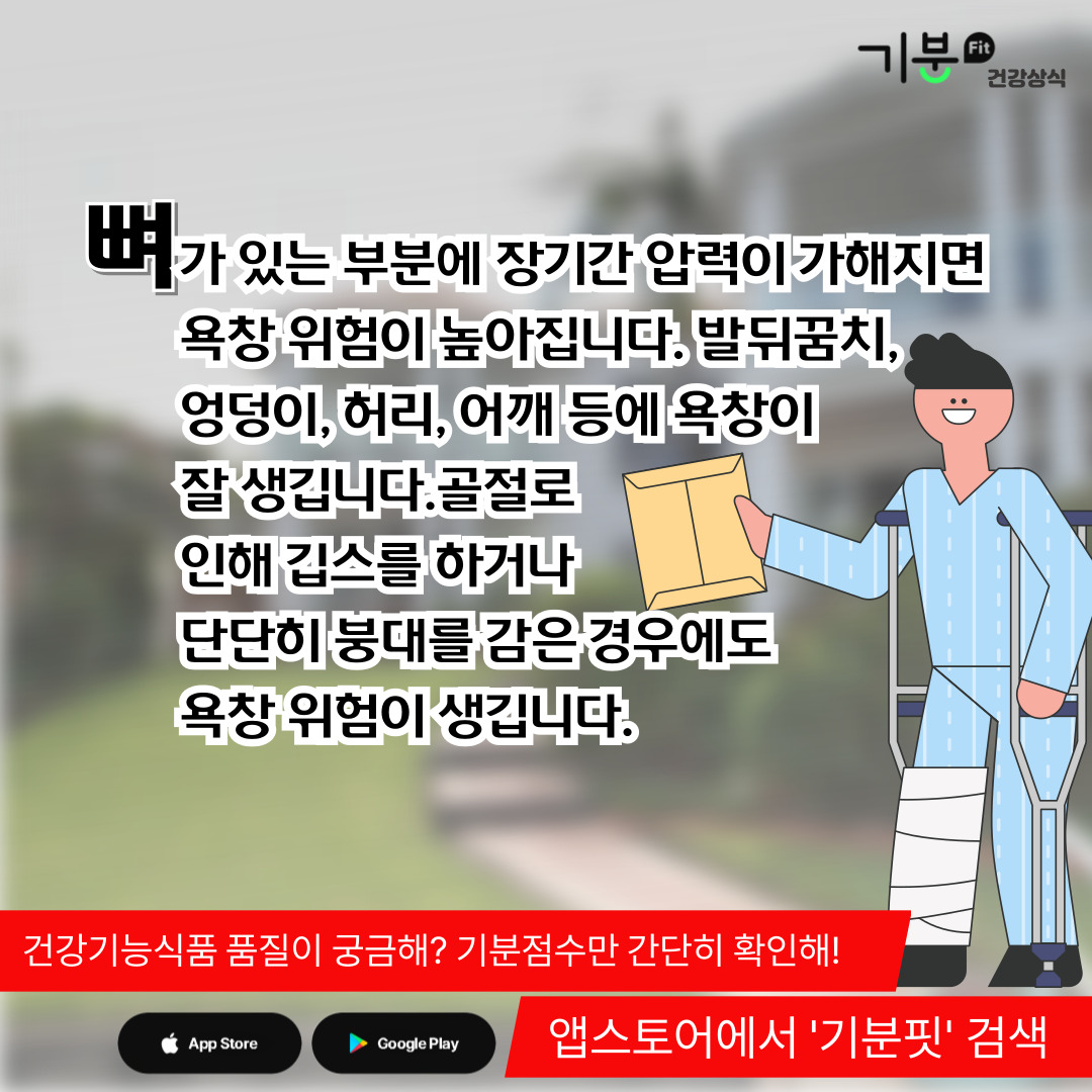 장기간 누워있는 사람들, 휠체어를 타는 사람들, 골절로 인해 깁스를 한 사람들은 욕창이 생기지 않도록 잘 관리할 필요가 있다.