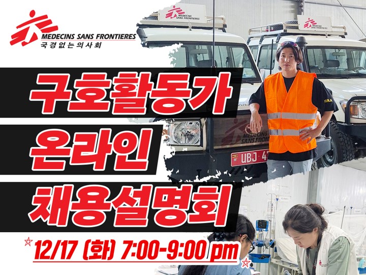 국제 인도주의 의료 구호단체 국경없는의사회가 오는 17일 목요일 저녁 7시 구호활동가 온라인 채용설명회를 개최한다.