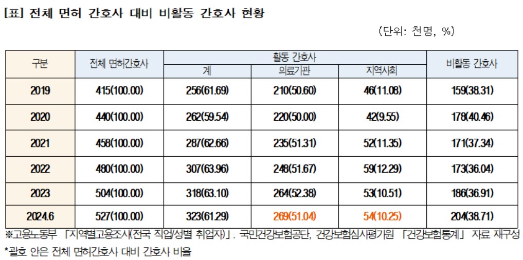 나머지 20만4천여 명은 의료 현장을 떠난 ‘유휴 간호사’로, 이는 2019년 15만9천여 명 대비 28.3%(4만5천여 명) 늘어난 수치다. 특히 작년 6월 기준 의료기관 근무 간호사는 전체 면허 간호사의 51.04%에 그쳐, OECD 평균 활동률(68.2%)을 크게 밑돌고 있는 것으로 확인됐다.