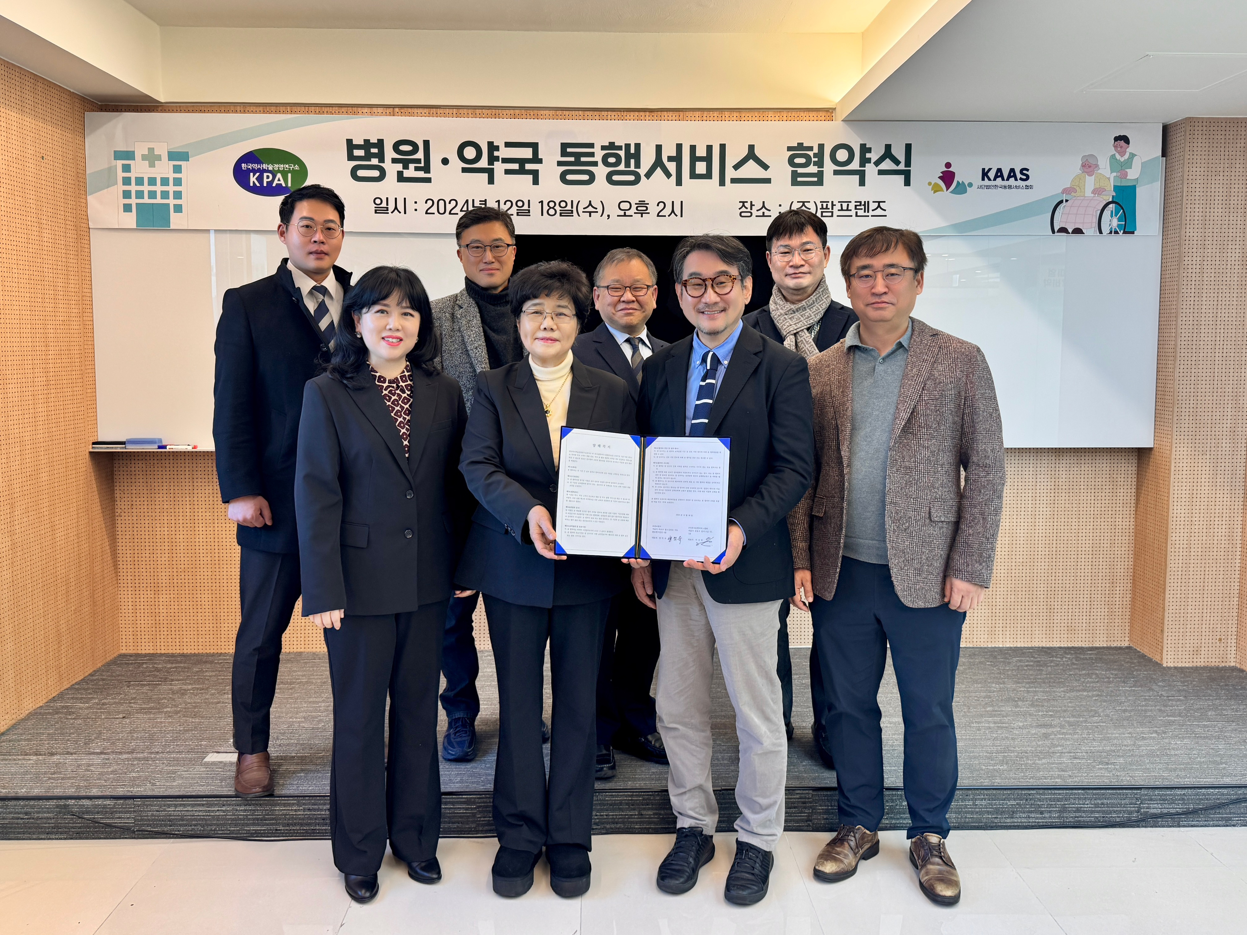 ㈜팜프렌즈(회장 양덕숙) 부설연구소인 한국약사학술경영연구소(KPAI)와 한국동행서비스협회(KAAS 이상헌)가 고령화와 더불어 저출생으로 가족의 돌봄이 어려운 현실에서 홀로 병원 진료, 약국 방문이 어려운분들을 위해 안심하고 서비스를 받을 수 있도록 '동행서비스 협약'을 18일 서울 마포구 ㈜팜프렌즈에서 체결했다.