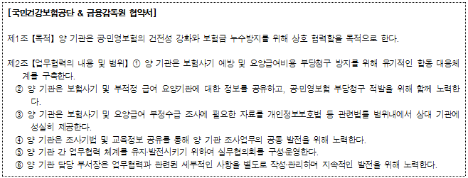 협약서는 이를 위해 보험사기 및 부적정 급여 요양기관에 대한 정보를 공유하고, 공공·민영보험 부당청구 적발을 위해 함께 노력한다고 규정하고 있다. 아울러 보험사기 및 진료비 부당청구 조사에 필요한 자료를 개인정보보호법 등 관련법률 범위 내에서 상대기관에게 성실히 제공하는 것도 규정되어 있다.