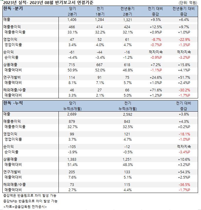 약업닷컴이 2023년 8월 반기보고서(연결기준) 분석 결과 한독의 상반기 매출은 2689억원으로 전년동기 대비 3.8% 증가했다. 영업이익은 99억원을 기록, 전년동기 대비 18.1% 감소했다. 105억원의 순손실을 내면서 12억원의 순손실을 기록했던 전년동기보다 손실폭이 더 커지면서 적자가 지속됐다.