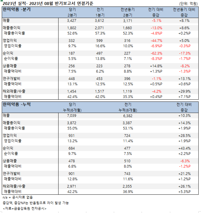 한미약품은 상반기 매출, 영업이익, 순이익 모두 두 자릿수 증가했다.