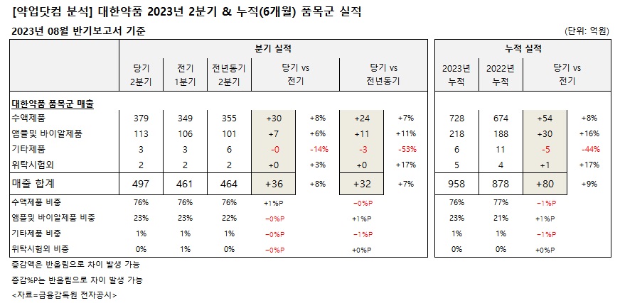 약업닷컴이 분석한 대한약품의 2분기 및 누적 품목군 실적에 따르면, 수액제품은 379억원, 앰플 및 바이아제품은 113억원, 기타제품 3억원, 위탁시험 외 2억원으로 총 497억원의 실적을 기록했다.