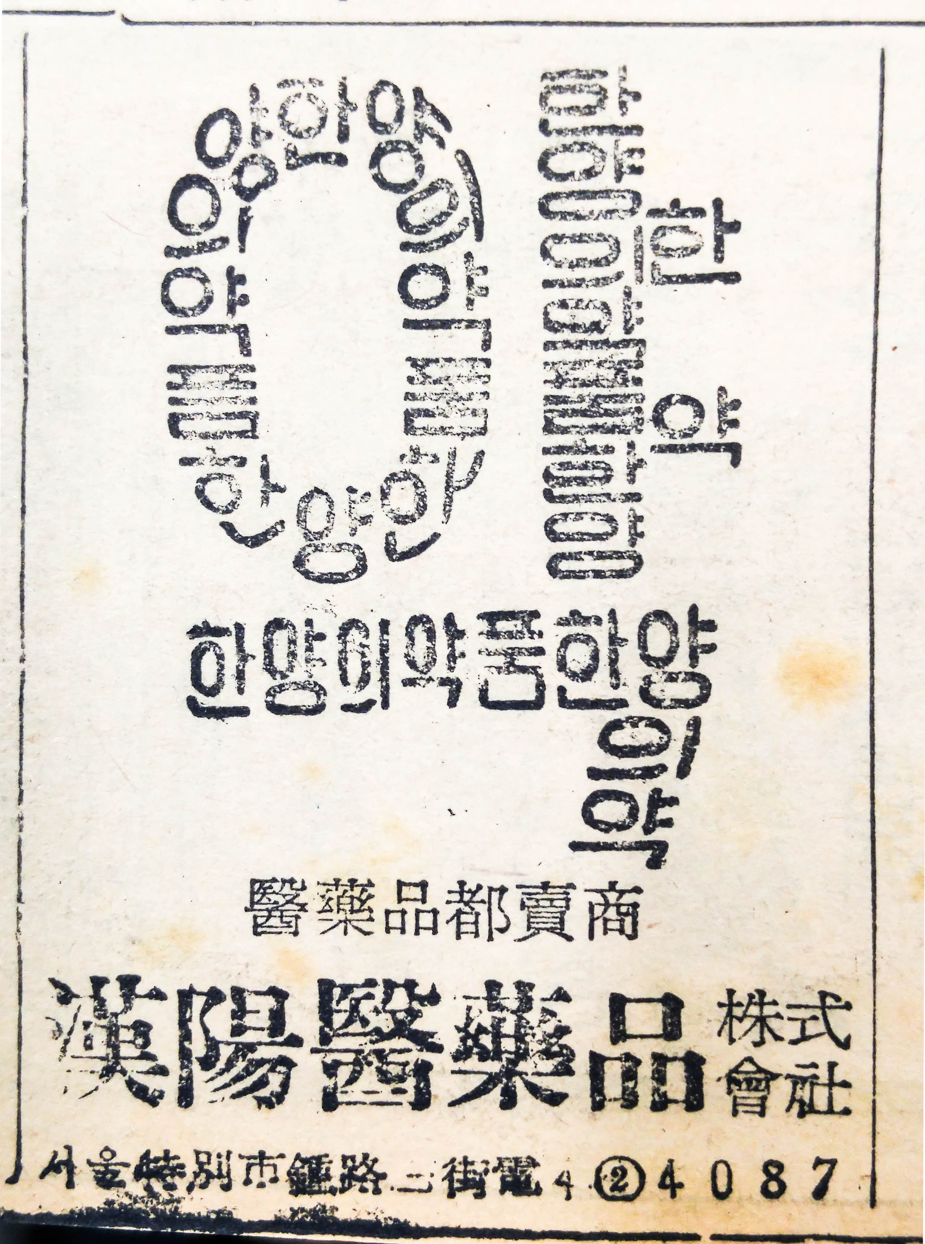 의약품 도매업을 주력으로 하는 한양의약품을 알리는 회사광고로 당시로서는 획기적인 광고문구와 이미지가 돋보인다. 이 광고에서 한양의약품 이라는 다섯글자로 ‘약’이라는 단어를 형상화 한 아이디어가 무척이나 참신하다.