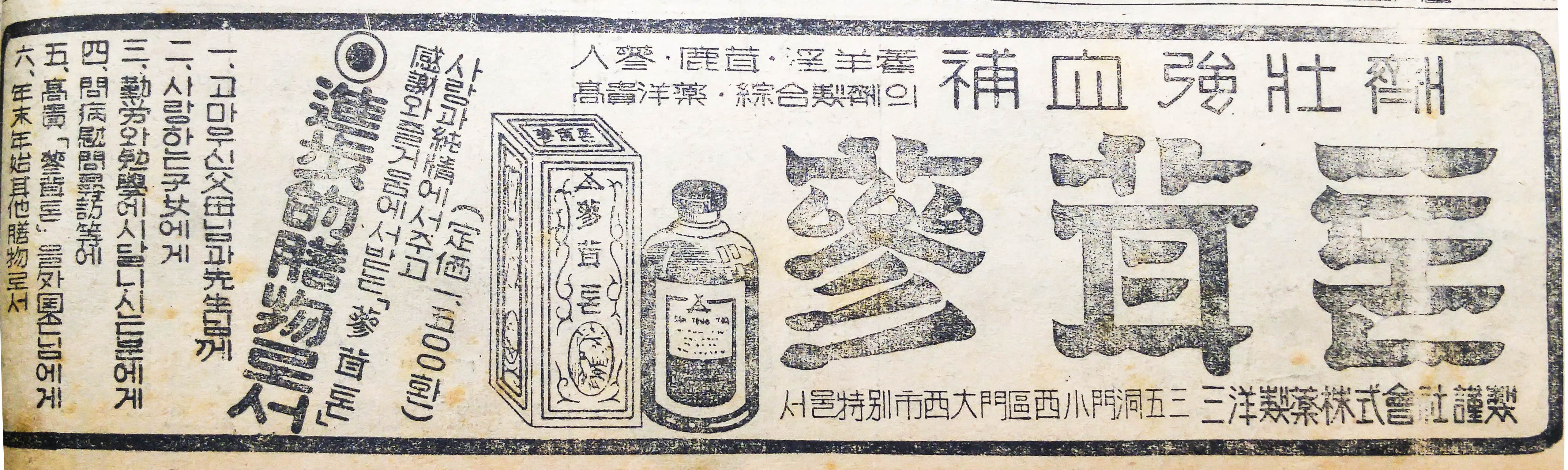 2단 고정광고로 시직된 이 광고는 고려인삼을 주성분으로 한 제품이라는 점을 강조하는‘高麗人蔘製劑(고려인삼제제)라는 문구가 선명하다.