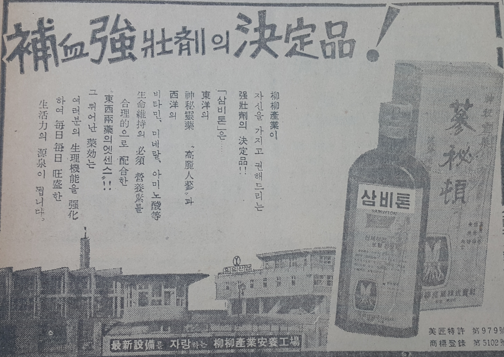 유유산업 삼비톤 광고 . 보혈강장제의 결정품 삼비톤은 동양의 신비한영약 고려인삼과 서양의 비타민 미네랄 아미노산 등 생명유지를 위한 필수영양소를 합리적으로 배합한 동서양약의 에센스라고 강조하고 있다.
