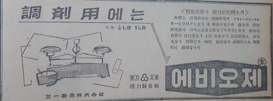 삼일제약 에비오제 광고. 배탈 설사 소화불량 등 유독 소화기계 환자가 많았던 1960년대 병원과 약국에서 많이 처방되고 조제된바 있는 강력한 소화효소제 에비오제는 특히 조제용으로 애용된 제품이다. 미국 약정국이 인정한 강력한 소화효소군과 각종 미네랄이 활성상태로 보유된 특징을 가진 동제품은 병원 약국 조제용으로 가장 이상적인 산제라는 광고문구가 눈길을 사로잡는다.