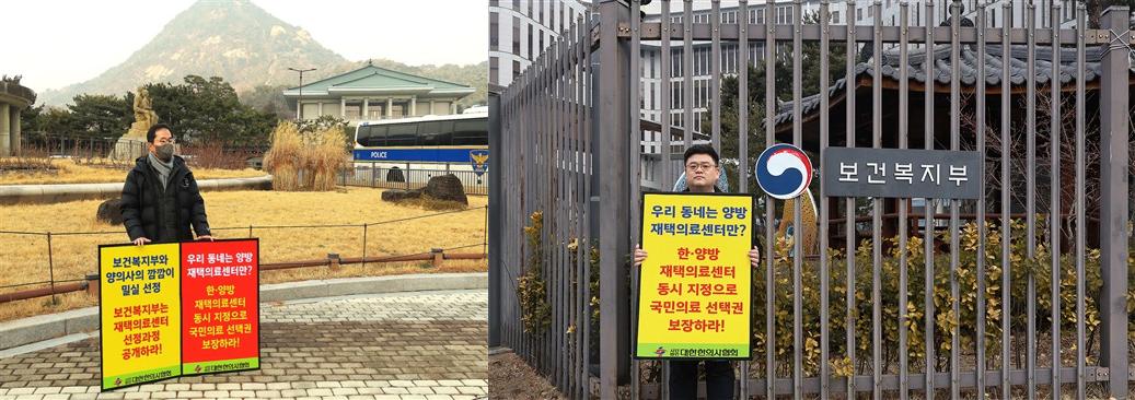 이날 서만선 대한한의사협회 부회장은 청와대 앞에서, 김지호 부회장은 보건복지부 앞에서 각각 1인 시위를 벌이며 재택의료센터 추가 선정 과정의 문제점을 지적했다.