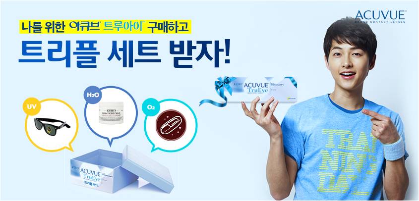 콘택트렌즈 브랜드 아큐브가 송중기 렌즈 '원데이 아큐브 트루아이'에 적용된, 트리플케어를 널리 알리기 위해 8월 21일부터 9월 30일까지 소비자 이벤트를 실시한다.