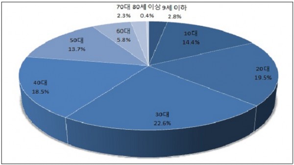 연령별로는 20~40대의 비율이 전체 진료인원 중 60.6%를 차지해 다른 연령층에 비해 많은 것으로 분석되었다.(2013년 기준)