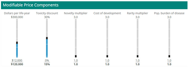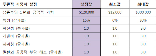 이 같은 고려사항에 대한 가중치를 주관적(주관적 가중치=생존수명 1년의 금액적 가치, 독성(감가율) 혁신성(증가율) 개발비(증가율) 희귀성(증가율) 질환의 공공적 부담 해소(증가율))으로 설명할 수 있도록 해, 그 결과가 주는 특정 항암제의 적정가치를 실질적인 금액(시장가격)과 비교할 수 있도록 한다는 것.
