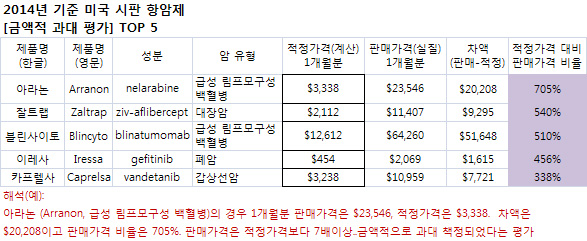 예로 '아라논' 경우 1개월 분 판매가격은 23,546불, 적정가격은 3,338불(차액= 20,208불)로, 판매가격이 적정가격보다 7배이상이라는 얘기다.