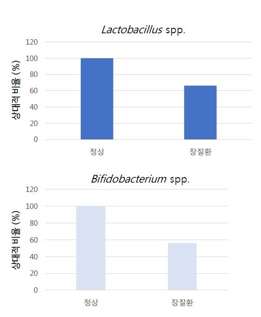실험 결과에 따르면 장질환을 가진 그룹이 정상인에 비해 락토바실러스(Lactobacillus spp.)와 비피도박테리움(Bifidobacterium spp.) 등 평균 유익균의 수가 약 40% 적게 관찰됐다. 반면 유해균인 클로스트리디움(Clostridium spp.)은 30% 더 높게 나타났다.