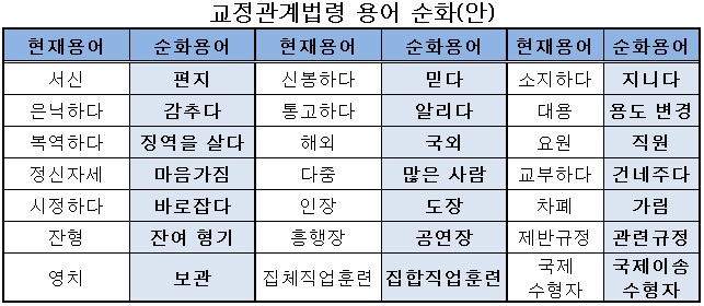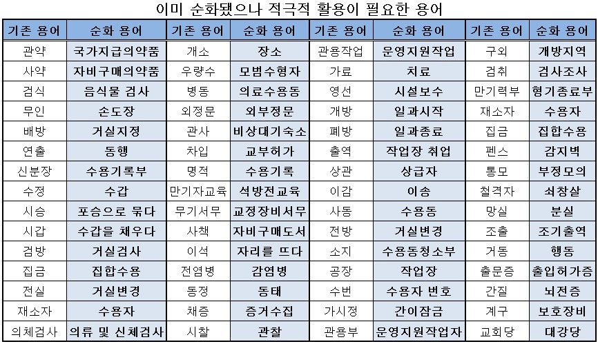 교정관계법령 용어 중 국민들이 어려워하는 20여개 용어, 순화어로 대체 한다.