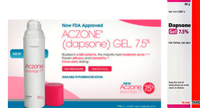 다스포네는 여드름을 비롯하여 각종 피부증상을 치료하는 효과를 갖는 화합물이고, 화학명칭은4-[(4-aminobenzene) sulfonyl] aniline이다. 다스포네 5% 겔 제제 (Aczone 5%)은 2005년에 허가를 받았고,다스포네 7.5% 겔 제제 (Aczone 7.5%)은 2016년에 허가를 받았다. 오렌지북에 따르면, 다스포네 5% 겔 제제에 대하여 등재된 특허가 없고, 다스포네 7.5% 겔 제제에 대하여는 특허번호 9,161,926와 9,517,219가 등재되어 있다. 이들 특허의 ...