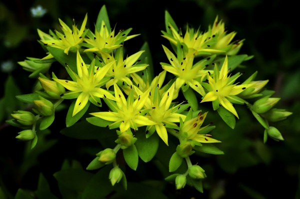 꽃받침과 꽃잎이 각각 5장 이어서 별과 같은 외모를 하고 있고 꽃은 끝이 뾰족한 피침 형이고 꽃 잎 사이사이로 꽃받침이 배열되어 있다. 수술은 10개 그리고 암술은 5개이다. 수술대는 꽃잎 크기정도로 길게 위로 뻗어있고 끝 부위에 붙어있는 꽃 밥은 수술대와 동일한 노란색을 띄고 있다가 시간이 지나면서 점점 검게 변한다. 꽃 전체가 노란색을 띄고 있는데 여기에 검은색 꽃 밥이 더해지면 검은 색과 어울려 꽃이 더욱더 아름답게 보인다.
