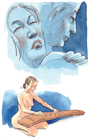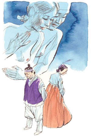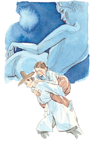밤새도록 사랑놀이를 하고도 진이와 이생은 피곤한 기색 없이 말에 올랐다. 말 등엔 거문고와 점심에 먹을 간단한 음식이 실렸을 뿐이다. 어차피 얻어먹으며 유람생활을 할 것을 이것저것 가지고 가지 않기로 마음먹었다. 묘향산을 출발하여 지리산을 거쳐 금강산으로 들어 갈 생각이다. 그래도 진이의 속주머니엔 외숙부가 건넨 비상금이 있다.