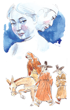 두 사내와 한 여자는 송도유람에 나섰다. 사가정의 제의로 성사되었다. 자동선은 술과 안주를 챙겼다. 그리고 자동선은 나귀에 올랐다. 사가정은 영천군에게 나귀 탈 것을 권하고 싶었으나 아직 효령대군의 자제라는 것을 밝히지 않은 상태다. 건장한 사내에게 나귀를 타라고 여자인 자동선에게 양보를 권할 수는 없기 때문이다.
