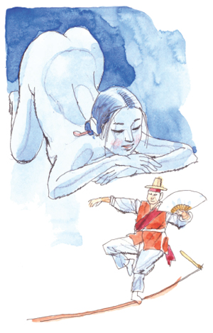 한양 손님을 통해 진이는 남사당(男寺党)에 대해 오래전부터 정보를 모아왔다. 남색사회(男色社會)에 대한 관심이 발동하였다. 진이가 이제 조선사회에서 더 이하 신분은 없는 남사당에 뛰어들 태세다. ‘안성 청룡 바우덕이/ 소리만 들어도 돈 나온다./ 안성 청룡 바우덕이/ 치마만 들어도 돈 나온다./ 안성 청룡 바우덕이/ 줄 위에 오르니 돈 쏟아진다./ 안성 청룡 바우덕이/ 바람을 날리며 떠나들 가네...’ 그랬다. 민요로까지 나돌 정도로 대중적 인기가 높다.