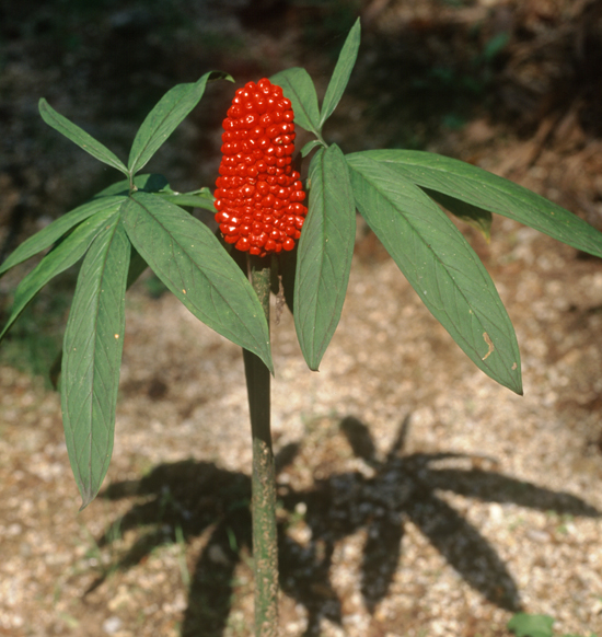10-11월 경 가을에는 먹음직스러운 옥수수 이삭 모양의 붉은 열매가 열린다. 옥수수알갱이처럼 생긴 붉은 알갱이가 다닥다닥 붙은 집합과이다. 유독함으로 절대로 먹어서는 안 된다. 천남성을 ‘첫 남성’과 무슨 관계가 있지 않을까 하는 생각도 하지만 첫 사랑의 연인과는 아무런 관계가 없다.