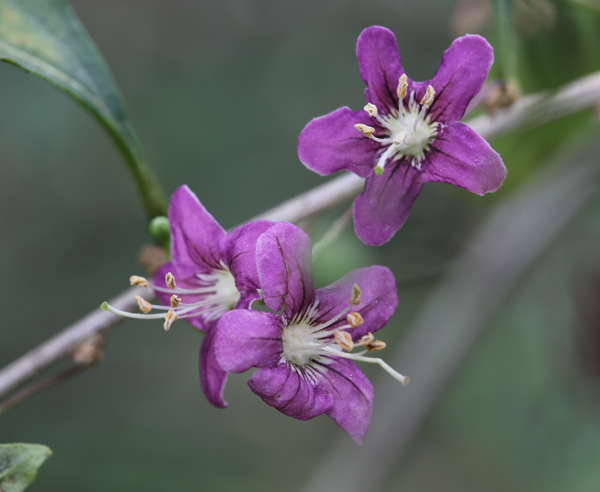 다른 식물에 비해서 꽃이 늦게 피는데 늦여름에서 초가을에 접어드는 시기인 7-9월에 가지의 잎겨드랑이에 1-4 송이의 연한 보라색 꽃을 피운다. 꽃은 전체적으로 종 모양을 하고 있고 꽃잎처럼 보이는 것은 꽃받침이 변한 것으로 끝 부분이 5 갈래로 얕게 갈라지고 진한 줄무늬가 있다.
