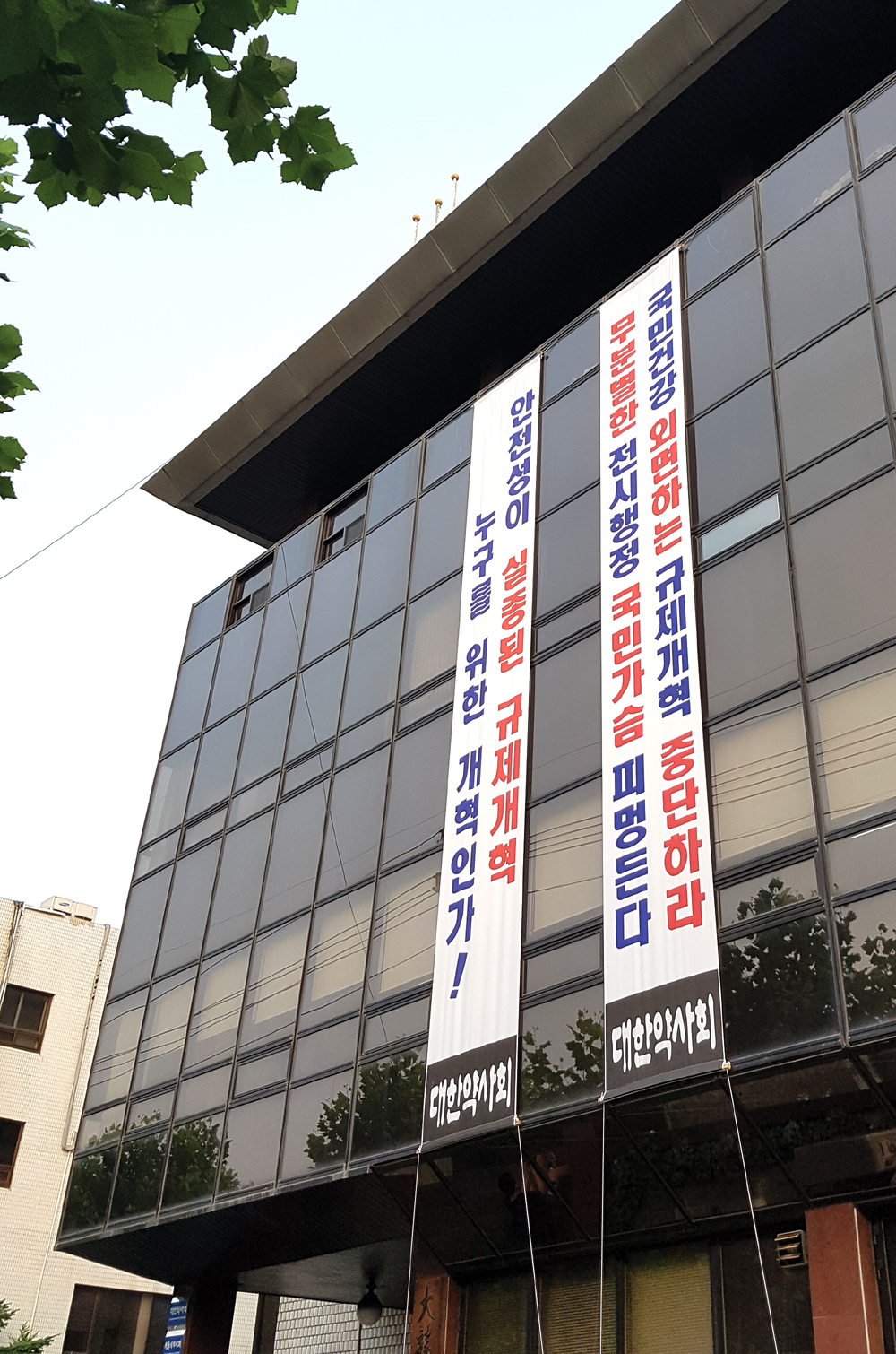 “국민건강 외면하는 규제개혁 중단하라” 현수막 게시
