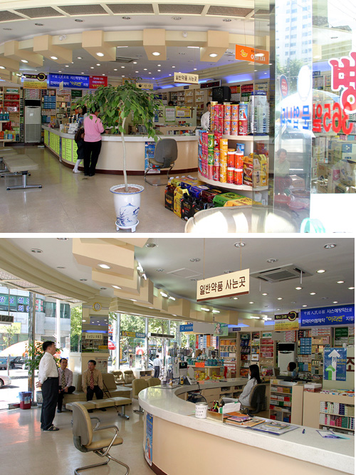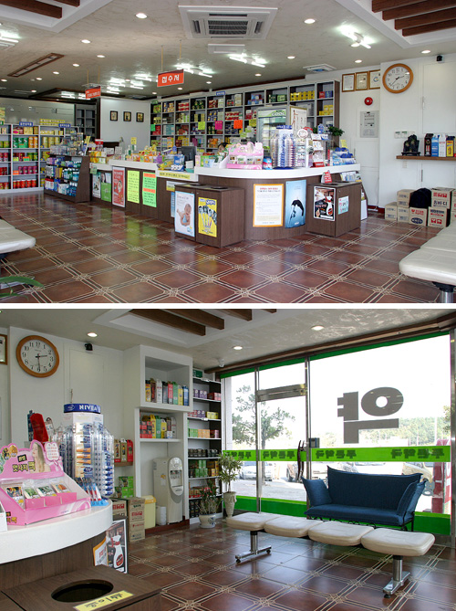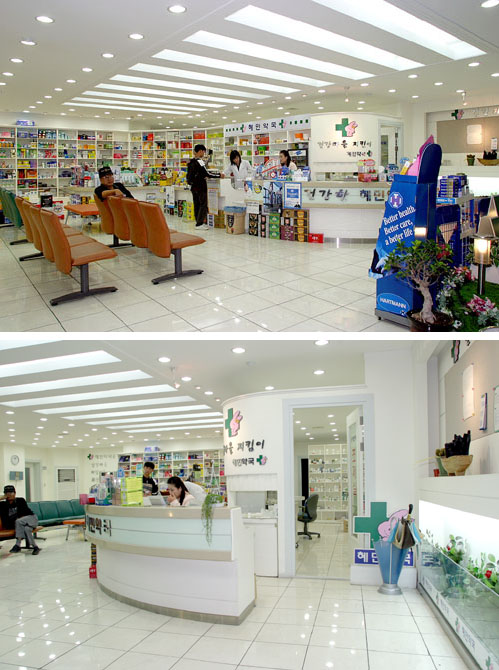 이런 조제실 배치와 벽면 위주로 진열장을 설치해 막상 약국에 들어서면 너무 단조롭다는 느낌이 들 정도로 깔끔한 이미지를 연출하고 있다.