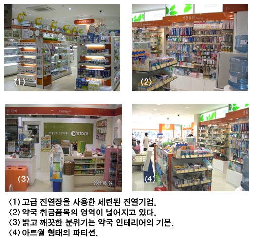 이 약국은 조제 약국의 한계를 벗어나 내방 고객들의 구매를 유도하여 매출을 향상시킬 수 있도록 다양한 제품과 인테리어의 조화로 보통 약국들과는 다른 드럭스토어라는데 초점을 맞추어 가능성을 보인 모델이라고 하겠다.
