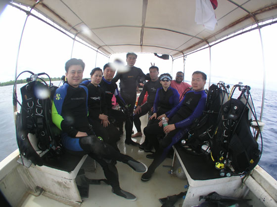 자, 이제 마지막 다이빙이다. 바다는 우리들의 세상. 갖가지 포즈로 사진을 찍는다. 물구나무선다든지 손에 손잡고 원을 그린다든지... 마침 라일락 산호아래서 선글라스를 끼고 폼을 재는 친구도 있다. 마도로스파이프를 물거나 넥타이를 매기도 하고.... 즐겁기도 하지만 아쉬운 순간이다.
