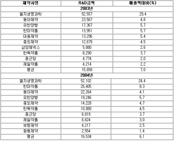 자료 : 한국보건산업진흥원. 2004년도 보건산업 연구개발실태 조사·분석. 2005 / 약업신문.