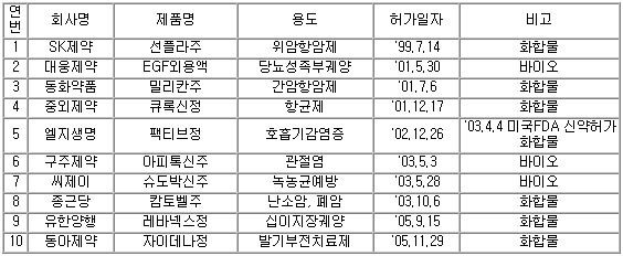 - 1999년 최초로 국내개발 신약허가후 2005년까지 10개 제품이 신약으로 허가받았음
