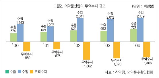 - 의약품 수출은 2000년 5.7억불에서 2004년 7.7억불로 증가한 반면 수입은 같은 기간 14.4억불에서 21.4억불로 증가하여 2004년 무역역조가 13.7억불에 달하는 등 무역역조 규모가 커지고 있음